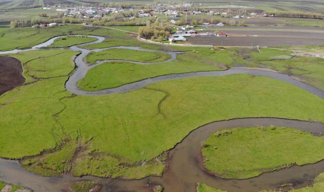 Kars'ta yeşilin tonları, meralarda otlayan hayvan sürüleri ve gökyüzünün mavisiyle birleşen Arpaçay Menderesleri görsel şölen sunuyor.Kars'ın doğal güzelliklerinden biri olan Arpaçay Menderesleri, baharda adeta bir tabloyu andıran manzaralar sunuyor. Coşkuyla akan suların arasında meralara yayılan hayvan sürüleri, kentin doğayla birleşen bütün güzelliklerini gözler önüne seriyor. Mendereslerin yanı başında bulunan Arpaçay'a bağlı Okçuoğlu köyünde yaşayan Tanju Altay, mendereslerin Kars turizmine kazandırılmasını istedi. Çok sayıda fotoğrafçının köylerine gelerek mendereslerin fotoğrafını çektiğini ifade eden Altay, "Menderesler Arpaçay'dan doğarak, köyümüzün sınırlarından kıvrım kıvrım süzülerek Hazar Denizi'ne dökülüyor. Mendereslerin köyümüz sınırından geçmesi köyümüze ayrıca bir güzellik katıyor. Yazın ayrı güzel, kışın ayrı güzel oluyor. Kışın yerli ve yabancı turistlerin köyümüze gelerek mendereslerin fotoğraflarını çekmesi bizi gururlandırıyor. Yazın da ayrı güzel oluyor. Çiçeklerin, kuş cıvıltılarının mendereslerle birleşmesi bir başka güzel oluyor. Buranın turizme kazandırılmasını bekliyoruz" dedi.Arpaçay'dan doğan ve kıvrılarak Aras Nehri ile buluşan menderesler, uzun yolculuktan sonra Hazar Denizi'ne dökülüyor. Mendereslerin yılan gibi kıvrımları, meraların yeşili ve hayvan sürüleri ile birleşmesi eşsiz bir görsel şölen oluşturuyor. Her mevsim bir başka güzelliğe bürünen menderesler, dronla havadan görüntülendi.