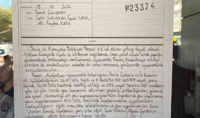 Karşıyaka Belediyesinde çalışan ve bin 227 işçiyi kapsayan toplu iş sözleşmesi görüşmelerinde anlaşma olmayınca belediye kapısına grev kararı asıldı. Anlaşma sağlanamazsa onlarca işçi 19 Kasım 2024 tarihinde greve gidecek.