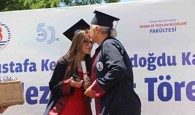 Ondokuz Mayıs Üniversitesi (OMÜ) İletişim Fakültesi öğrencisi Selin Soytürk, kas hastalığına rağmen eğitimini fakülte üçüncüsü olarak tamamladı. Soytürk, dört yıl boyunca her gün kendisine refakat eden babasıyla mezuniyet sahnesine çıkarak alkış topladı.OMÜ İletişim Fakültesi 2024-2025 Mezuniyet Töreni, azmin ve fedakârlığın öne çıktığı anlara sahne oldu. Kas hastalığı (miyopati) nedeniyle eğitim hayatı boyunca çeşitli zorluklarla karşılaşan Selin Soytürk, mezuniyetini fakülte 3'üncüsü, bölümünü ise 2'nci olarak tamamladı. Soytürk'e, bu süreçte her gün okula birlikte geldiği babası Yetkin Soytürk eşlik etti.Selin Soytürk, dört yıl boyunca babasıyla birlikte Samsun'un Çarşamba ilçesinden otobüsle üniversiteye giderek derslerine eksiksiz katıldı. Zorlu süreci anlatan Soytürk, "Bir insan eğitim hayatında ne kadar yoruluyorsa, ben on katı yoruluyordum. Başarıyı çok çalışarak ve kendimle yarışarak elde ettim" dedi.Babaya sahnede cübbe sürpriziMezuniyet töreninde Soytürk'e destek olan babasına da özel bir jest yapıldı. İletişim ve Tasarımı Bölümü öğretim elemanları, Yetkin Soytürk için bir mezuniyet cübbesi hazırladı. Baba Soytürk, sahneye kızıyla birlikte çıkarak diplomayı ve başarı belgesini teslim aldı. Duygusal anlar yaşayan Selin Soytürk, "Babam sahnede yer almayı öğrenciler kadar hak ediyordu. Sahnede derece almaktan çok, o an benim için daha kıymetliydi. Emeklerinin karşılığını almak çok özeldi" diye konuştu.Yetkin Soytürk ise duygularını, "Sahneye çıkmak çok gurur verici. Dört değil yirmi yılın karşılığını orada gördük. Çektiğimiz tüm zorluklara değdi" sözleriyle dile getirdi."Umarım herkes bir gün kendi dünyasını keşfeder"Selin Soytürk, toplu taşımada yaşadığı zorluklara da değinerek, "Engelli kartım olmasına rağmen otobüslerde yer bulmak için mücadele ettik. En çok da kendimi açıklamak zorunda kalmak yıpratıcıydı. Ama bu bir engel değil. Umarım yaşadıklarım başkalarına cesaret verir" ifadelerini kullandı.Sayısal yeteneği olmadığını düşündüğü için eksiklik hisseden öğrencileri de cesaretlendiren Soytürk, "İnsanlar kendi yeteneklerini keşfetsin. Sisteme uymaya değil, kendi yolunu çizmeye çalışsın. Umarım herkes bir gün kendi dünyasını keşfeder" dedi.Törene fakülte akademisyenlerinin yanı sıra çok sayıda öğrenci ve aile de katıldı.