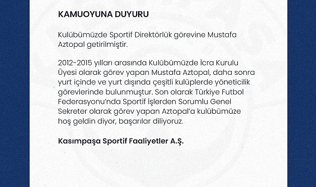 Kasımpaşa, sportif direktörlük görevine Mustafa Aztopal'ın getirildiğini açıkladı.Lacivert-beyazlı kulüpten konuya ilişkin yapılan açıklamada, "Kulübümüzde Sportif Direktörlük görevine Mustafa Aztopal getirilmiştir. 2012-2015 yılları arasında Kulübümüzde İcra Kurulu Üyesi olarak görev yapan Mustafa Aztopal, daha sonra yurt içinde ve yurt dışında çeşitli kulüplerde yöneticilik görevlerinde bulunmuştur. Son olarak Türkiye Futbol Federasyonu'nda Sportif İşlerden Sorumlu Genel Sekreter olarak görev yapan Aztopal'a kulübümüze hoş geldin diyor, başarılar diliyoruz" denildi.