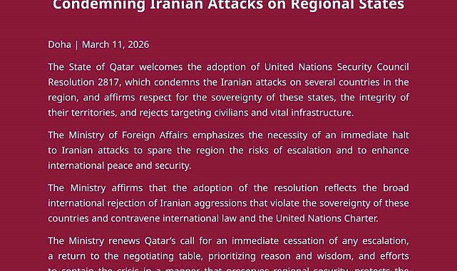 Katar Dışişleri Bakanlığı'ndan yapılan açıklamada, Birleşmiş Milletler Güvenlik Konseyi'nin İran'ın bölge ülkelerine yönelik saldırılarını kınayan bir karar tasarısını kabul etmesinin memnuniyetle karşılandığı belirtilerek, taraflara müzakere masasına geri dönme çağrısında bulunuldu.