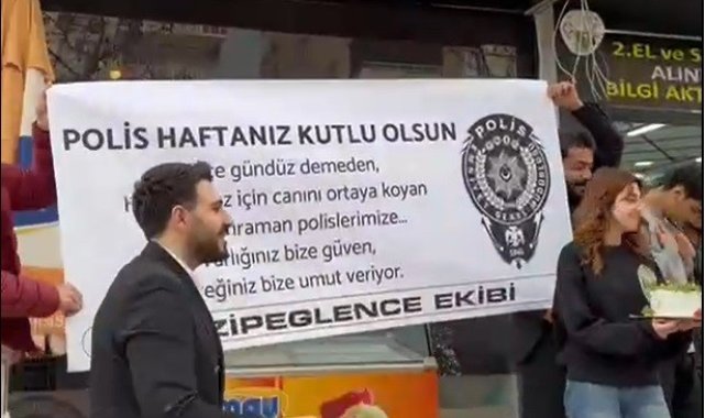 Kavga ihbarına gelen polisleri pankart ve pasta ile karşıladılar