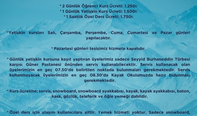 Kayseri Büyükşehir Belediyesi Spor A.Ş.'nin Kayak Okulu Yeni Dönem kayıtları başladı. 8-9 Şubat 2025 7-15 yaş çocuk kursu, 4-9 Şubat 2025 tarihlerinde ise 16 yaş ve üzeri yetişkinler için hem kayak hem de snowboard kursu kayak meraklılarını Erciyes'te buluşturacak.2024 Avrupa Spor Şehri Kayseri'de sporseverlerin gözdelerinden biri olan Kayak Okulu, dolu dolu bir sömestir dönemini geride bırakmaya hazırlanırken yeni dönem kayıtlarını da başlattı. Kayseri'de Büyükşehir Belediyesi, kış turizminin yanı sıra kentte kayak sporunun gelişimini hedefleyen Kayak Okulu ile düzenlediği kayak ve snowboard kurslarını hız kesmeden sürdürüyor. Spor A.Ş. tarafından hizmet verilen Kayak Okulu'nda, 8-9 Şubat 2025 7-15 yaş çocuk kursu, 4-9 Şubat 2025 tarihlerinde ise 16 yaş ve üzeri yetişkinler için hem kayak hem de snowboard kursu için müracaatlar başladı. Spor A.Ş. Kayak Okulu'nda yetişkin kursları Salı, Çarşamba, Perşembe, Cuma, Cumartesi ve Pazar günleri şeklinde planlanırken 2 günlük öğrenci kurs ücreti 1.250 TL, 1 günlük yetişkin kurs ücreti 1.500 TL, 1 saatlik özel ders ücreti ise 1.750 TL olarak belirlendi. Günlük kayak kursuna kayıt yaptıran üyeler sadece Seyyid Burhaneddin Türbesi karşısı Güner Pastanesi önünden servis kullanabilecek ve servis kullanacak olan üyeler en geç saat 07.00'de belirlenen noktada bulunarak servisle Erciyes'e ulaşacak. Servis kullanmayacak üyeler ise en geç saat 08.30'da Kayak Okulu'nda hazır bulunacak. Yeni dönem kursları, kurs ücretine; servis, snowboard, snowboard ayakkabısı, kayak, kayak ayakkabısı, baston, kask, gözlük, teleferik ve öğle yemeği dâhil olarak kayak severlere sunuldu. Öte yandan 7-15 yaş arası katılımcılar için servis güzergâhları ise Talas hattı: Anayurt meydan - Emniyet Sitesi önü - Kaymakamlık otobüs durağı - Köşk Sosyal Yaşam Merkezi önü, İpeksaray hattı: İpek Saray önü - Emirgan Parkı önü - Cumhuriyet Meydanı kale önü otobüs durağı - Seyyid Burhaneddin Türbesi karşısı olarak belirlenirken, yetişkin kursları için servis hareket noktası Seyyid Burhaneddin Türbesi karşısı olarak belirlendi.Kayak severler, Kayak Okulu kurslarına ilişkin detaylı bilgiye 0532 479 10 38 numaralı telefon üzerinden erişebilecek ve kayıt işlemleri için www.sporaskayseri.com internet adresini ziyaret edebilecekler.