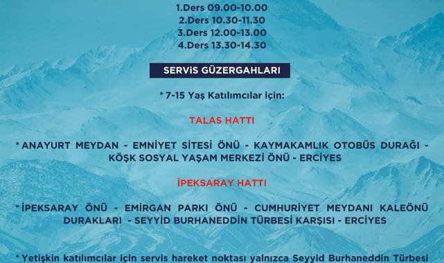 Kayseri Büyükşehir Belediyesi Spor A.Ş.'nin Kayak Okulu Yeni Dönem kayıtları başladı. 8-9 Şubat 2025 7-15 yaş çocuk kursu, 4-9 Şubat 2025 tarihlerinde ise 16 yaş ve üzeri yetişkinler için hem kayak hem de snowboard kursu kayak meraklılarını Erciyes'te buluşturacak.