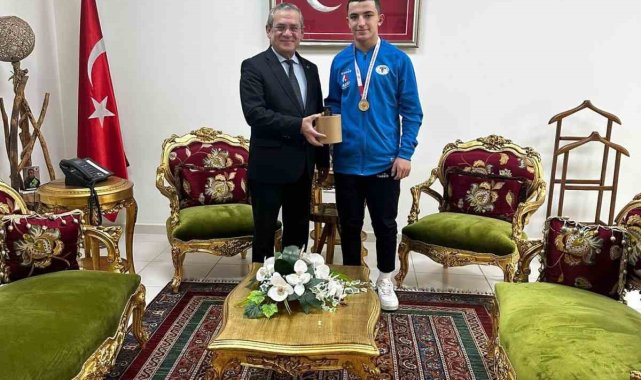 Okul Sporları B Genç 67 Kilo Erkekler Halter Türkiye Birinciliği müsabakalarında Türkiye Şampiyonu olan Menteşe Spor Lisesi öğrencisi Tuna Yaraş, Menteşe Kaymakamı Mehmet Eriş'i makamında ziyaret etti.