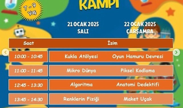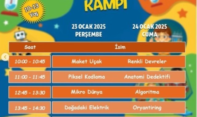 Kayseri Büyükşehir Belediyesi bünyesinde faaliyetlerini sürdüren, Türkiye'deki 6 TÜBİTAK destekli bilim merkezinden birisi olan Kayseri Bilim Merkezi'nin 21-24 Ocak günlerinde düzenleyeceği Yarıyıl Kampı için kayıtlar başladı.Anadolu Harikalar Diyarı içerisinde yer alan, her dönem bilim meraklılarının ilgi odağı olan ve Büyükşehir Belediyesi bünyesinde hizmet veren Kayseri Bilim Merkezi, her yıl yaz dönemi ve yarıyıl tatillerinde öğrencilere yönelik düzenlediği kamplara yenilerini ekleyerek devam ediyor.Bu kapsamda Kayseri Bilim Merkezi, 17 Ocak 2024'te öğrencilerin yaşayacağı karne heyecanı ile başlayacak 2024-2025 Eğitim Öğretim Yılı yarıyıl tatiline dolu dolu bir kampla hazırlanıyor.Kayseri Bilim Merkezi'nin düzenleyeceği, öğrencilerin verimli ve keyifli bir tatil geçirmelerine katkı sunacak Yarıyıl Kampı 21 Ocak'ta başlayıp ikişer günlük 4 kamp olacak şekilde planlandı.Yarıyıl Kampı ile öğrencilerin bilim ve teknolojiye olan ilgisini arttırmayı, düşünme becerilerini geliştirmeyi ve farklı bilimsel alanlarda uygulamalı eğitimler almasını sağlamayı hedefleyen Kayseri Bilim Merkezi, kampta çeşitli atölye çalışmaları, deneyler, robotik kodlama gibi konularda etkinlikler gerçekleştirecek.Yarıyıl Kampı'nda 21 Ocak saat 10.00'da başlayacak günün programı; Kukla Atölyesi, Mikro Dünya, Algoritma, Renklerin Fiziği ve Gökevi Eğitimi şeklinde belirlenirken 22 Ocak yine saat 10.00'da başlayacak günün programı Oyun Hamuru Devresi, Piksel Kodlama, Anatomi Dedektifi ve Maket Uçak şeklinde planlandı.Kampın devam eden gününde 23 Ocak saat 10.00'da başlayacak program; Maket Uçak, Piksel Kodlama, Mikro Dünya, Doğadaki Elektrik ve Gökevi Eğitimi şeklinde belirlenirken, 24 Ocak saat 10.00'da başlayacak günün programı Renkli Devreler, Anatomi Dedektifi, Algoritma ve Oryantiring şeklinde planlandı.Katılımcılar, eğitmenler eşliğinde eğlenceli bir şekilde bilimsel kavramları öğrenirken, aynı zamanda grup çalışmaları ile sosyal becerilerini de geliştirecek.Kayseri Bilim Merkezi Yarıyıl Kampı için kayıt başvurusunda bulunmak isteyen veliler 0 (352) 222 89 01 ve 0 (352) 222 45 67 numaralı telefonlar üzerinden işlemlerini gerçekleştirebilecek.