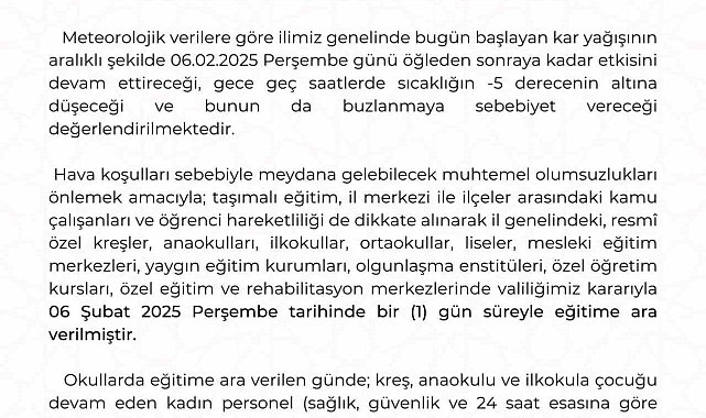 Kayseri'de yoğun kar yağışı nedeniyle eğitime 1 gün ara verildi.Kayseri Valiliği'nden yapılan açıklamada, "Meteorolojik verilere göre ilimiz genelinde bugün başlayan kar yağışının aralıklı şekilde 6 Şubat 2025 Perşembe günü öğleden sonraya kadar etkisini devam ettireceği, gece geç saatlerde sıcaklığın -5 derecenin altına düşeceği ve bunun da buzlanmaya sebebiyet vereceği değerlendirilmektedir. Hava koşulları sebebiyle meydana gelebilecek muhtemel olumsuzlukları önlemek amacıyla; taşımalı eğitim, il merkezi ile ilçeler arasındaki kamu çalışanları ve öğrenci hareketliliği de dikkate alınarak il genelindeki, resmî özel kreşler, anaokulları, ilkokullar, ortaokullar, liseler, mesleki eğitim merkezleri, yaygın eğitim kurumları, olgunlaşma enstitüleri, özel öğretim kursları, özel eğitim ve rehabilitasyon merkezlerinde valiliğimiz kararıyla 06 Şubat 2025 Perşembe tarihinde 1 gün süreyle eğitime ara verilmiştir. Okullarda eğitime ara verilen günde; kreş, anaokulu ve ilkokula çocuğu devam eden kadın personel (sağlık, güvenlik ve 24 saat esasına göre hizmet veren birimlerde çalışan personelin durumu hizmetin gereği olarak ilgili birim amirleri tarafından değerlendirilecektir), malul, engelli, ağır kronik rahatsız ve hamile kamu çalışanları da idari izinli sayılacaktır" denildi.