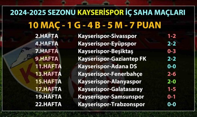 Kayserispor, sahasında oynadığı son 3 iç saha maçında galip gelemiyor. Sarı-kırmızılıların 1 iç saha galibiyeti bulunuyor.Süper Lig'de var olma mücadelesi veren Kayserispor, galibiyete ulaşamıyor. Geride kalan 22 haftada 10 iç saha maçına çıkan sarı-kırmızılılar, sadece 1 kez kazandı. Son 3 iç saha maçında 1 beraberlik, 2 yenilgi alan Kayserispor taraftarı önünde 7 puan toplayabildi. Sarı-kırmızılı ekip, 10 iç saha maçında 10 gol atarken kalesinde 21 gol gördü.Kayserispor'un bu sezon sahasında oynadığı maçlar ve aldığı sonuçlar şöyle:2. Hafta: Kayserispor-Sivasspor: 1-24. Hafta: Kayserispor-Eyüpspor: 2-27. Hafta: Kayserispor-Beşiktaş: 0-39. Hafta: Kayserispor-Gaziantep FK: 2-211. Hafta: Kayserispor-Adana DS: 0-013. Hafta: Kayserispor-Fenerbahçe: 2-615. Hafta: Kayserispor-Alanyaspor: 2-017. Hafta: Kayserispor-Galatasaray: 1-519. Hafta: Kayserispor-Samsunspor: 0-122. Hafta: Kayserispor-Trabzonspor: 0-0