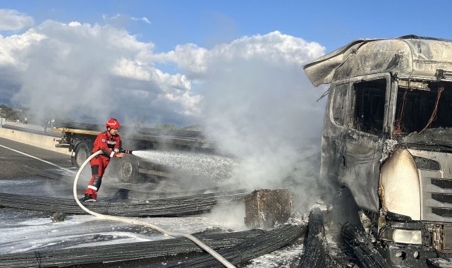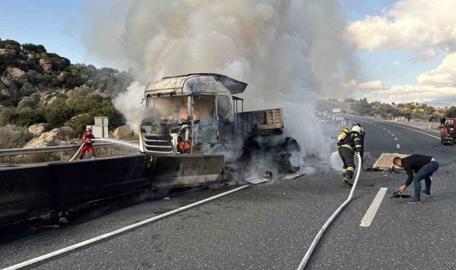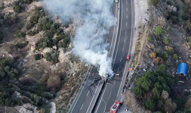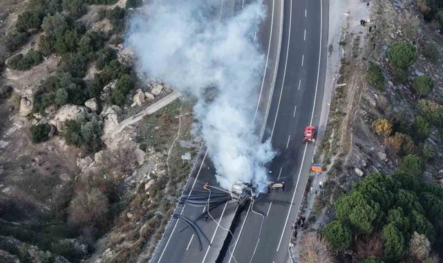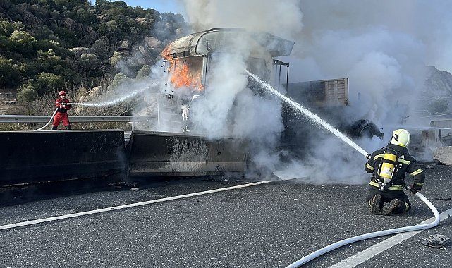 Aydın-Muğla karayolu üzerinde meydana gelen kaza sonrası çıkan yangında tır kullanılmaz hale geldi.Edinilen bilgiye göre, Muğla- Aydın karayolu her iki ilin sınır noktasında meydana gelen kazada lastiği patlayan ve yoldan çıkan tır beton bariyerlere çarparak alev aldı. Kazada yaralanan olmazken yapılan ihbar üzerine bölgeye Muğla Büyükşehir Belediyesi İtfaiye ve jandarma ekipleri sevk edildi. Kısa sürede olay yerine ulaşan ekipler, Tırı saran alevlere müdahale ederek yangını kontrol altına aldı. Yangında araç kullanılmaz hale geldi. Söndürme çalışmaları sırasında her iki yönde de kilometrelerce araç kuyruğu oluştu.Olayla ilgili soruşturma sürüyor.