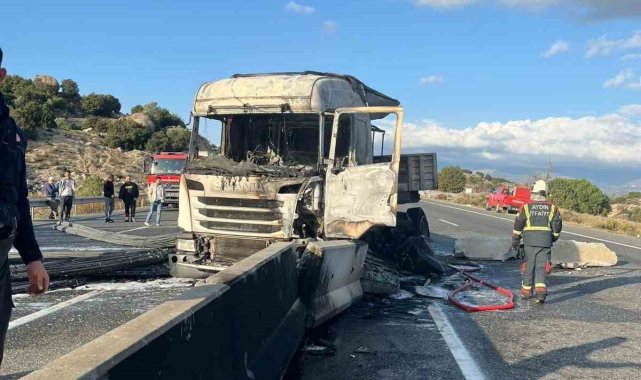 Aydın-Muğla karayolu üzerinde meydana gelen kaza sonrası çıkan yangında tır kullanılmaz hale geldi.