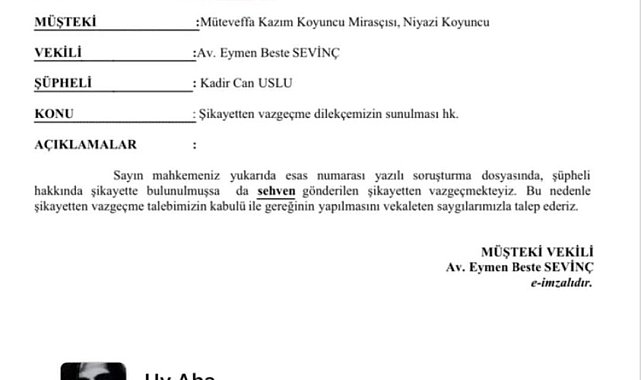 "Uy Aha" şarkısını izin almadan sosyal medyasında paylaşan öğretmenden şikayetçi olup, 50 bin lira tazminat isteyen müzisyen Kazım Koyuncu'nun mirasçısı Niyazi Koyuncu şikayetini geri çekti.Müzisyen Kazım Koyuncu'nun mirasçısı Niyazi Koyuncu, "Uy Aha" şarkısını izin almadan sosyal medyasında paylaştığı için öğretmen Kadir Can Uslu'dan avukatı aracılığıyla şikayetçi olmuş ve 50 bin lira telif tazminatı istemişti. Şikayet üzerine Uslu emniyete gidip ifade vermişti. Olayla ilgili haberlerin ardından Niyazi Koyuncu, Adana Cumhuriyet Başsavcılığı tarafından yürütülen soruşturma kapsamında Kadir Can Uslu hakkındaki şikayetini geri çekti. Konuya ilişkin resmi dilekçe, Koyuncu'nun vekili avukat Eymen Beste Sevinç tarafından savcılığa sunuldu."Şikayet sehven gönderildi" açıklamasıSavcılık makamına sunulan dilekçede, söz konusu şikayetin "sehven gönderildiği" ifadesine yer verildi. Dilekçede müşteki tarafının şikayetten vazgeçtiği açıkça belirtilerek, şikayetin geri çekilmesi talebinin kabul edilmesi talep edildi. Kazım Koyuncu'nun yakın çevresi ve ailesi tarafından ise herhangi bir açıklama yapılmadı."Şikayetin sehven yapıldığını anlatan bir mail aldım"Öğretmen Uslu, kendisine şikayetin geri çekildiği yönünde mail geldiğini belirterek, "Şikayetin sehven yapıldığını anlatan bir mail aldım. Mailde şikayetten vazgeçildiği belirtiliyor. Ben zaten bu şikayete bir anlam verememiştim. Kazım Koyuncu çok sevdiğim bir sanatçıydı. Onun eserlerini beğenerek dinliyordum" dedi.Uslu, ayrıca avukatlık bürosundan da telefonla arandığını ifade ederek, "Arayan kişi bana şikayetin stajyer avukat tarafından sehven yapıldığını söyledi. Neyse ki konu tatlıya bağlandı" diye konuştu.Karadeniz müziğinin önemli isimlerinden olan Kazım Koyuncu'nun vefatının ardından ailesi, sanatçının isminin, eserlerinin ve hatırasının korunmasına yönelik çeşitli hukuki süreçlerle zaman zaman gündeme gelmişti. Bu olayın ise tamamen teknik bir hata sonucu oluştuğu ve taraflar arasında bir anlaşmazlığın bulunmadığı kaydedildi.