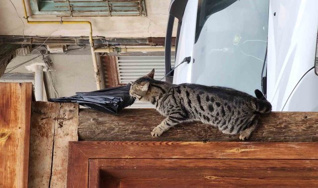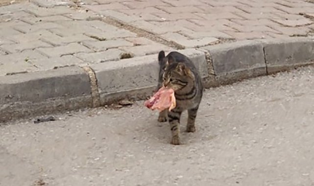 Tokat'ta iki kediden biri gözcülük yaparken, diğerinin asılı poşetteki eti alabilmek için sergilediği mücadele izleyenleri gülümsetti.Zile ilçesi Dutlupınar Mahallesi'nde iki kedinin bir binanın ahşap kolonunda asılı olan siyah poşete ulaşmak için sergilediği çaba kameraya yansıdı. Kedilerden biri poşeti alabilmek için kolona tırmanırken, diğeri ona gözcülük etti. Uzun uğraşlar sonucunda poşeti ulaşan kedi, poşetin içindeki et parçasını almayı başardı. Daha sonra iki kedi birlikte hızla uzaklaştı.Kedilerin eti çaldıkları anı cep telefonuyla görüntüleyen Ejder İren, "Zile ilçesinde yaşıyorum. Buraya kahveci bir ağabeyimizin asmış olduğu eti tırmanarak buradan almaya çalıştı. O anı da ben telefonla çektim. Kedinin azmi bizi hayran bıraktı" dedi.Görüntüler izleyenleri de gülümsetti.