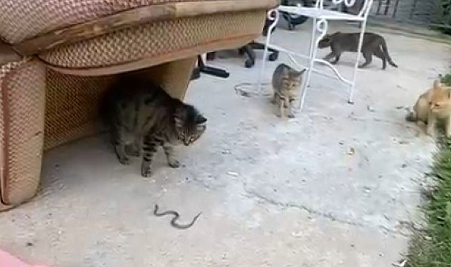 Gümüşhane'de bahçede karşılarına çıkan yavru yılanla oynayan kedilerin görüntüleri cep telefonu kamerasıyla kaydedildi.Gümüşhane'nin merkeze bağlı Eskibağlar Mahallesi'nde bir vatandaş tarafından kaydedilen görüntülerde, kedilerin karşılarına çıkan yavru yılanla oynadığı anlar yer aldı. Kedilerin zaman zaman pençeleriyle dokunduğu, zaman zaman da yılanı yakalamaya çalıştığı anlar ilginç görüntüler oluşturdu.