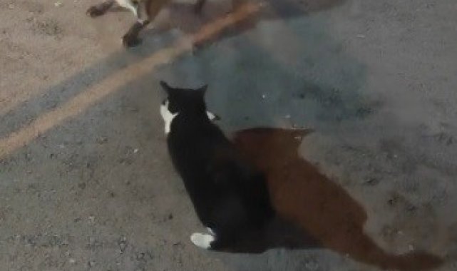 Kediyle tilkinin yemek mücadelesi yüzlerde tebessüm oluşturdu