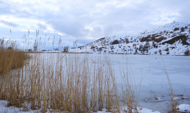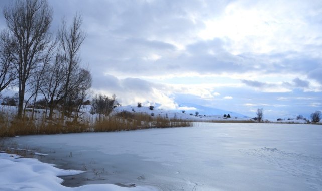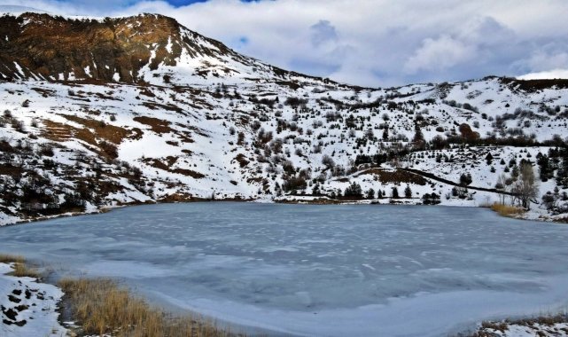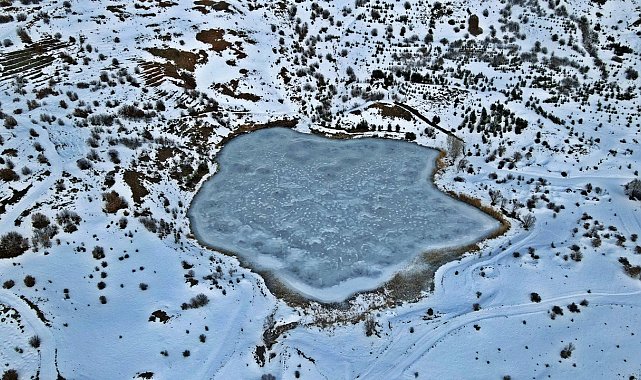 Erzincan Kemah'taki Ardos Gölü, kış mevsiminde tamamen buzla kaplandı. Drone ile görüntülenen bin 660 rakımlı gölün eşsiz manzarası, doğaseverleri kendine hayran bırakıyor.Erzincan'ın Kemah ilçesine bağlı Beşikli köyünde yer alan Ardos Gölü, etkili olan soğuk hava nedeniyle dondu. Deniz seviyesinden bin 660 metre yükseklikte bulunan göl, drone ile havadan görüntülendi.Cam gibi donan göl yüzeyi ve çevresini saran doğal doku, bölgeyi adeta bir kış tablosuna dönüştürdü. Havadan kaydedilen görüntüler, Ardos Gölü'nün doğayla iç içe olan eşsiz konumunu gözler önüne serdi.Bu benzersiz manzarayı kaçırmak istemeyen doğaseverler ve fotoğraf meraklıları, zorlu kış şartlarına rağmen bölgeye gelerek, gölün sunduğu huzur dolu atmosferi yerinde deneyimliyor. Ziyaretçiler, Ardos Gölü'nün özellikle kış aylarında farklı ve etkileyici bir güzelliğe büründüğünü dile getirdi.Doğaseverlerden Kemal Arduç, araçlarının belli bir noktaya kadar gelebildiğini, o nedenle göle yürüyerek gelmek zorunda kaldıklarını belirterek, "Biz doğaseverler olarak sadece yazın değil, kışın da tadını çıkarmaya çalışıyoruz. Erzincan'da ağır kış mevsimi yavaş yavaş kendini bahara doğru atıyor. Karlar erimeye başladı. Şu anda Ardos Gölü'ndeyiz. Karlar eriyince gölün üzerindeki buz da meydana çıktı. Bütün göllerimiz şu an buz tutmuş halde. Geldik, gördük, burada pikniğimizi yaptık. Bundan sonra bahar mevsimini bekleyeceğiz. Baharda buranın ayrı bir güzelliği var. yeri var buranın. Bu göl normal bir göl değil, doğal bir göl. Akarı da yok buranın. Herkesi bu gölü görmeye bekliyoruz. Ayrıca bu göle veya bunun gibi birçok göle ulaşmak da kolay olmuyor, yürüyerek geldik. Aracımız bir noktaya kadar çıktı, yollar kapalı. Bayağı bir yürüdük, malzemelerimizle birlikte yürüdük ama değdi" dedi.Ardos Gölü'nün doğal ve tarihi değerleriyle öne çıktığını vurgulayan Beşikli köyü Muhtarı Süleyman Ayan ise, "Ardos Gölümüz, Erzincan Kemah ilçesine bağlı Beşik köyünde bulunmaktadır. Bin 660 rakımda bulunuyor. Gölümüzün 25 metre derinliği ve yaklaşık 850 metre çevre ölçümü var. Tarihi mezarlıklarımız var, çok eski en az 500 yıllık tarihi mezarlıklarımız var. Doğal güzelliğe gelen misafirlerimiz burada çok mutlu oluyorlar. İnşallah burayı daha güzel bir mesire alanına çevirmek istiyoruz. Sayın valimizin desteğiyle, onun talimatıyla burayı güzel bir mesire alanına da dönüştürmek istiyoruz. Gelen misafirlerimiz burada keyifle otursun, vakit geçirsin" şeklinde konuştu.Dört mevsim ayrı bir güzellik sunan Ardos Gölü, kışın buzla kaplanan yüzeyiyle Erzincan'ın keşfedilmeyi bekleyen doğal değerleri arasında öne çıkıyor.