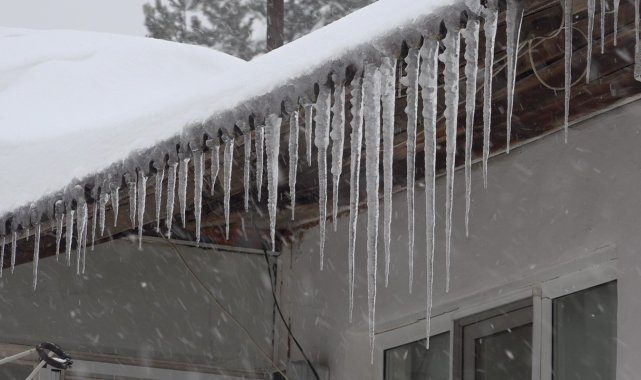 Kırklareli'nin yüksek kesimlerde kar yağışı etkisi sürdürürken soğuk hava ile birlikte çatılarda buz sarkıtları oluştu.