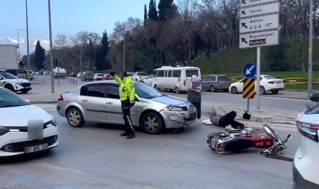 Denizli'nin Merkezefendi ilçesinde kırmızı ışık ihlali yaptığı iddia edilen otomobil sürücüsü, seyir haline geçen motosiklete çarptı. Çarpmanın etkisiyle otomobil ve motosiklette maddi hasar oluşurken, motosiklet sürücüsü yaralandı.