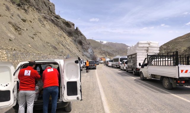 Hakkari-Van kara yolunda meydana gelen heyelan nedeniyle ulaşımın durduğu bölgede yolda mahsur kalan vatandaşlara Türk Kızılay tarafından kumanya desteği sağlandı.