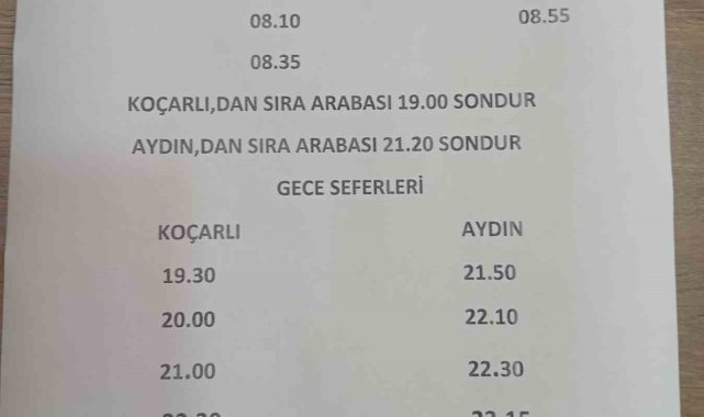 Aydın'ın Koçarlı ilçesinde Koçarlı Birlik minibüs saatleri 21 Nisan 2026 tarihinden itibaren güncellendi.Koçarlı Şoförler Odası tarafından yapılan duyuruda, ilçe ile Aydın şehir merkezi arasında yolcu taşımacılığı yapan Koçarlı Birlik minibüslerinin hafta içi ve hafta sonu sefer saatlerinde değişikliğe gidildiği belirtildi. Yeni düzenlemeye göre, Koçarlı'dan hafta içi sabah seferleri 06.30, 07.00 ve 07.25 saatlerinde başlarken, Aydın'dan hareketler ise 07.10, 07.30, 07.50, 08.10 ve 08.35 olarak güncellendi.Hafta sonu programında da değişikliğe gidilirken, Koçarlı'dan 06.30, 07.00 ve 07.30 saatlerinde sefer düzenleneceği, Aydın'dan ise 07.10, 07.45, 08.20 ve 08.55 saatlerinde minibüslerin hareket edeceği bildirildi.Ayrıca yapılan düzenlemeye göre Koçarlı'dan son seferin saat 19.00'da, Aydın'dan son seferin ise 21.20'de gerçekleştirileceği ifade edildi. Gece seferleri kapsamında da Koçarlı'dan 19.30, 20.00, 21.00 ve 22.30, Aydın'dan ise 21.50, 22.10, 22.30 ve 23.15 saatlerinde karşılıklı seferlerin devam edeceği öğrenildi.Koçarlı Şoförler Odası'ndan yapılan açıklamada vatandaşların mağduriyet yaşamamaları adına yeni saatlere dikkat etmeleri gerektiği hatırlatıldı.