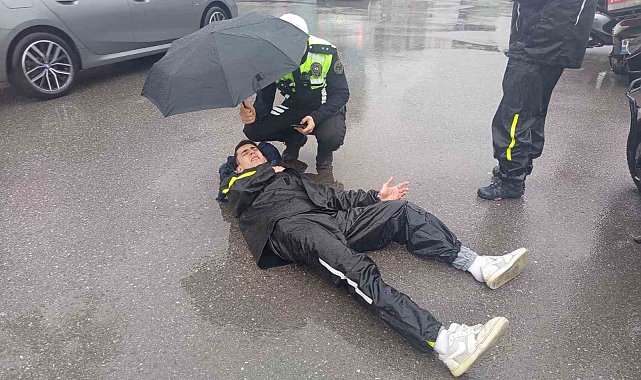 Zonguldak'ın Ereğli ilçesinde meydana gelen trafik kazasında yaralanan motosikletli kurye, olay yerine gelen trafik komiserinin sergilediği örnek davranışla dikkat çekti.Kaza, Ereğli ilçesinde aynı istikamette seyir halinde olan 67 AET 104 plakalı motosiklet sürücüsü O.D. ile ticari taksi sürücüsü A.T.'nin çarpışması sonucu meydana geldi. Edinilen bilgiye göre, havanın yağışlı olması ve yolların kayganlaşması nedeniyle meydana gelen kazada motosiklet sürücüsü çarpmanın etkisiyle yere düştü.Yaralı kuryeye ilk müdahaleyi çevredeki vatandaşlar yaparken, olay yerine gelen Ereğli İlçe Emniyet Müdürlüğü'ne bağlı trafik tescil komiseri örnek bir davranış sergiledi. Komiser, yaralı kuryenin başında 112 Acil Sağlık ekipleri gelinceye kadar şemsiye tutarak bekledi.Olay yerine gelen 112 Acil Sağlık ekipleri, yaralıya ilk müdahaleyi yaptıktan sonra ambulansla ilçedeki özel bir hastaneye kaldırdı. Yetkililerden alınan bilgiye göre, motosikletli kuryenin sağlık durumunun iyi olduğu ve hayati tehlikesinin bulunmadığı öğrenildi.