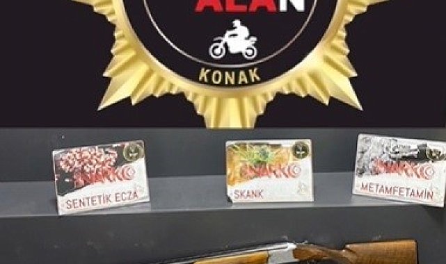 İzmir'in Konak ilçesinde polis ekipleri tarafından 12 ev ve 2 iş yerine gerçekleştirilen operasyonda, yüklü miktarda uyuşturucu ve ruhsatsız silahlar ele geçirildi. Olayla ilgili gözaltına alınan şüphelilerden 11'i çıkarıldıkları mahkemece tutuklandı.Konak İlçe Emniyet Müdürlüğü ve Narkotik Suçlarla Mücadele Şube Müdürlüğü ekipleri tarafından, Konak ilçesinde 9-19 Ekim tarihleri arasında, uyuşturucu ticaretini önlemeye yönelik çalışmalar gerçekleştirildi. Bu kapsamda, 12 ev ve 3 iş yerine baskınlar gerçekleştirilirken adreslerde yapılan aramalarda, 289 adet ekstazi hap, bin 341 adet uyuşturucu nitelikli yeşil reçeteye tabi sentetik hap, 102 gram kokain, 161 gram esrar, 210 gram metamfetamin ile uyuşturucu ticaretinden elde edilen 47 bin Türk Lirası, 200 ABD Doları, 1 hassas terazi, 2 ruhsatsız tabanca, 2 ruhsatsız pompalı tüfek, 1 av tüfeği, 21 mermi, 9 fişek ve 7 kartuş ele geçirildi.Operasyonlar kapsamında gözaltına alınan şüphelilerden G.A. (18), G.S. (28), T.G. (45), N.U. (42), M.T. (30), S.A. (40), G.U. (18), N.U. (45), B.D. (22), A.B. (28) ve İ.S. (37) adlı 11 şüpheli, emniyetteki işlemlerin ardından sevk edildikleri mahkemece tutuklandı.