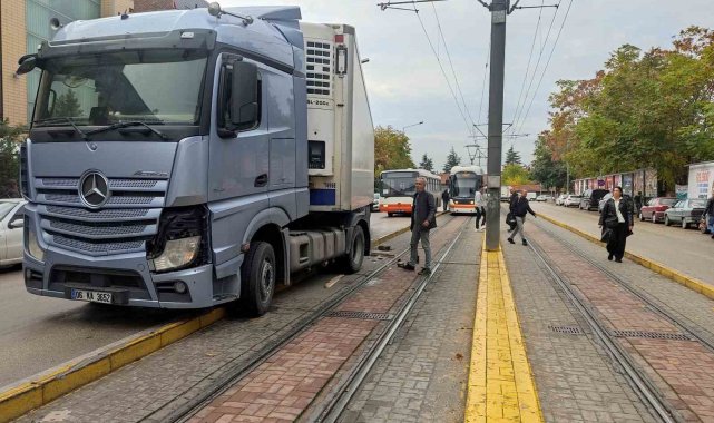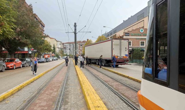Eskişehir'de kontrolden çıkan tırın tramvay yoluna girdiği kaza sonucunda maddi hasar oluşurken, toplu ulaşım seferleri aksadı.Olay, saat 09.00 sıralarında Fabrikacılar Caddesi üzerinde meydana geldi. Edinilen bilgilere göre; 06 KA 3652 plakalı tır, sürücüsünün direksiyon hakimiyetini kaybetmesi sonucunda tramvay yoluna girdi. Rayların kenarındaki taşlara takılan tır sebebiyle OTOGAR-SSK / OGÜ-SSK hatlarında tramvay seferleri yapılamazken, diğer karayolu araçları da ilerleyemedi. İhbar üzerine olay yerine polis ve ESTRAM ekipleri sevk edildi. Tırın bulunduğu yerden çekilmesi için çalışma başlatıldı. Ekiplerin gerekli müdahaleyi yapmasının ardından seferler normale döndü.Maddi hasarla atlatılan kazayla ilgili inceleme başlatıldı.