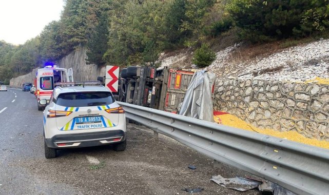 Bursa'nın İnegöl ilçesinde kontrolden çıkan yem yüklü TIR devrildi, sürücü ve eşi yaralandı.