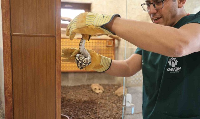 Konya'da polis ekipleri tarafından gerçekleştirilen asayiş kontrolü sırasında bir şahsın cebinden çıkan yavru piton yılanı, Doğa Koruma ve Milli Parklar ekiplerince teslim edildiği Karatay Belediyesi Hayvanat Bahçesinde özel ortamında bakım ve beslemeye alındı.