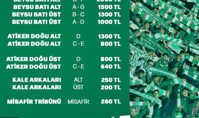 Konyaspor ile Samsunspor arasında oynanacak Trendyol Süper Lig 11. hafta maçının biletleri satışa sunuldu.Trendyol Süper Lig'in 11. haftasında Konyaspor, 2 Kasım Pazar günü saat 14.30'da Konya Büyükşehir Belediye Stadyumu'nda Samsunspor ile karşılaşacak. Müsabakanın biletleri, bugün saat 15.00 itibarıyla satışa sunuldu.Mücadelenin bilet fiyatları şöyle:Batı Üst VIP A-C: 3000 TLBeysu Batı Alt B-F: 2000 TLBeysu Batı Alt A-G: 1500 TLBeysu Batı Üst B-C: 1300 TLBeysu Batı Üst A-D: 1000 TLAtiker Doğu Alt D: 1300 TLAtiker Doğu Alt C-E: 800 TLAtiker Doğu Üst D: 800 TLAtiker Doğu Üst C-E: 640 TLKale Arkaları Alt: 250 TLKale arkaları Üst: 200 TLMisafir Tribünü: 260 TL