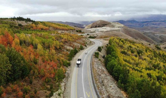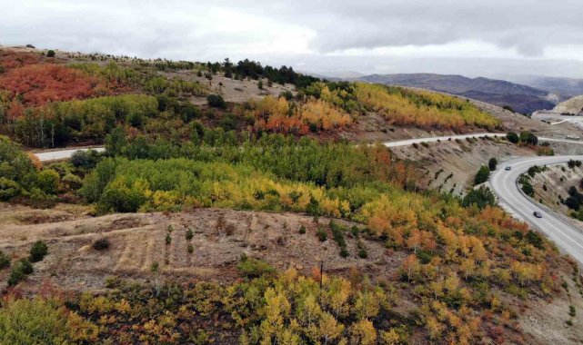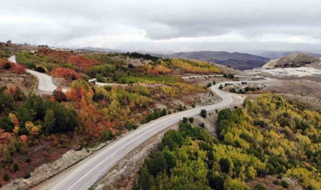 Bayburt'ta sonbahardan kışa geçişte 2 bin 400 rakımlı Kop Dağı güzergâhında renk cümbüşü oluşturan ağaçlar farklı bir güzelliğe büründü.Bayburt - Erzurum kara yolu üzeri Kop Dağı mevkiinde dağlar başta olmak üzere yüksek rakımlı bölgelerde sonbaharla oluşan doğal güzellikler, seyrine doyumsuz manzara sunuyor.İlkbaharda yemyeşil görüntüsüyle bölgeye ayrı renk katan farklı türdeki ağaçların yaprakları, sonbaharın gelmesiyle sararıp dökülmeye başladı.Sarı, kırmızı, mor ve yeşil renklere dönüşen ağaçlar, göz alıcı güzellikleriyle görenleri mest ediyor.Renk cümbüşüne dönen ve tabloyu andıran dağlardaki ağaçlar, doğaya ayrı renk katıyor. Dağlarda görülen rengarenk ağaçlar, yolda ilerleyen sürücülere güzel manzara izleme keyfi sunuyor.Rengarenk dağları izlerken keyif aldıklarını dile getiren vatandaşlar, "Buralar gezip görülecek yerler. Sonbaharda yapraklar sararmaya başladı ve her ağaç ayrı bir renk aldı." dedi.