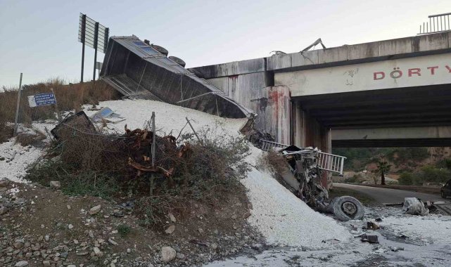 HATAY(İHA) – Hatay'da 2 tır, kamyonet ve otomobilin karıştığı kazada otoyol köprüsünden uçan tır alev alarak yandı. Kazada alevlere teslim olan tırın sürücüsü öldü, 2 kişi yaralandı.Kaza, Adana – Hatay otoyolu Dörtyol ilçesi Özerli köprüsü mevkiinde yaşandı. Kamyonet ve otomobilin çarpıştığı kaza sonrası Furkan Orhan Y. idaresindeki 01 ATT 106 plakalı tır, kaza yapan otomobil, kamyonet ve park halindeki tıra çarptı. Kaza sonrası 01 ATT 106 plakalı tır, köprüden aşağı uçarak alevlere teslim oldu. İhbar üzerine bölgeye itfaiye ve sağlık ekipleri sevk edildi. İtfaiye ekipleri alevleri kontrol altına alırken, olay yerindeki yaralılar ambulansla hastaneye sevk edildi. Yapılan kontrollerde yanan tırın sürücüsünün hayatını kaybettiği tespit edildi. Kazada yaralanan 2 kişinin hastanede tedavisinin devam ettiği öğrenildi.
