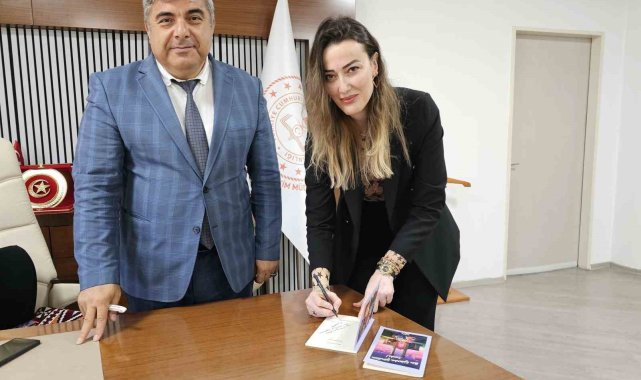 Kübra öğretmen yazdığı kitapları Müdür Sünnetci'ye takdim etti