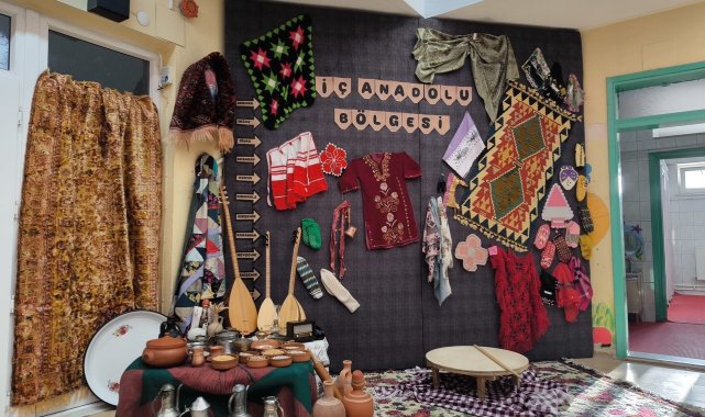 Konya'nın Kulu ilçesinde anaokulu öğrencileri için İç Anadolu Bölgesinde evlerde kullanılan eşyaları ve malzemeler ile yemeklerin tanıtımı için sergi açıldı.