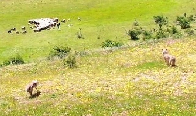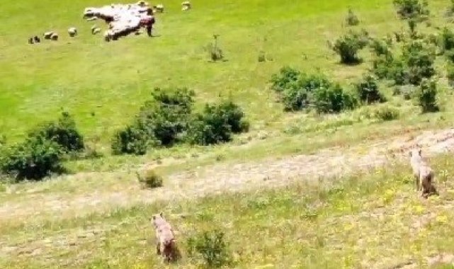 Erzincan'da iki kurt yaylada otlayan koyun sürüsüne, kavalı bırakıp dron ile sürü güden çoban ise kurtlara pusu attı.