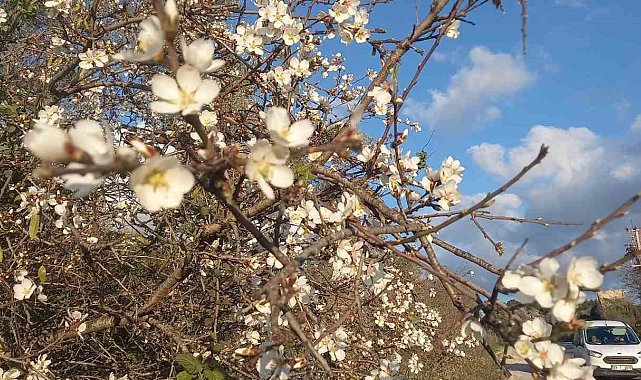 Aydın'ın Kuşadası ilçesinde bu yıl bahar erken gelirken 2025 yılının ilk ayı sona ermeden kış ortasında badem ağaçları çiçek açtı.Türkiye'nin doğusu başta olmak üzere birçok ilde kış mevsimi etkisini gösterirken Aydın'da adeta bahar havası yaşanıyor. Ülkenin doğusunda bulunan bazı illerin birçoğu karla kaplanırken, batısında bulunan illerden Aydın ise eski yıllardaki gibi kış yüzü göremedi. Çiçek açtıklarında büründükleri renkli görünümleri baharın müjdecisi olarak bilinen badem ağaçları bu yıl mevsimleri şaşırarak yılın ilk ayında çiçek açtı. Vatandaşların güneşin keyfini çıkarttığı Kuşadası ilçesinde çiçek açan badem ağaçları görsel bir şölen sunarak bölgedeki vatandaşların ilgisini çekti. Seyrine doyulmaz manzaralar ortaya çıktığı yol kenarlarında, vatandaşlar cep telefonlarına sarılarak çiçek açan ağaçları fotoğrafladı.