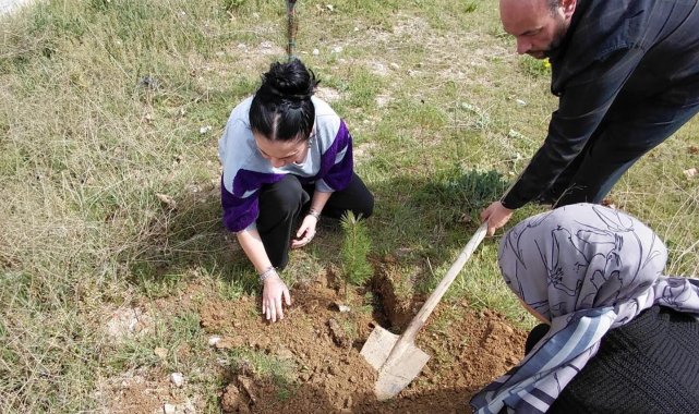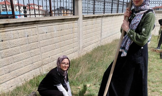 Kütahya Akşemsettin Kız Anadolu İmam Hatip Lisesi 11. sınıf öğrencileri, "Hikmet Projesi" kapsamında düzenlenen etkinlikte okul bahçesinde çam fidanlarını toprakla buluşturdu.