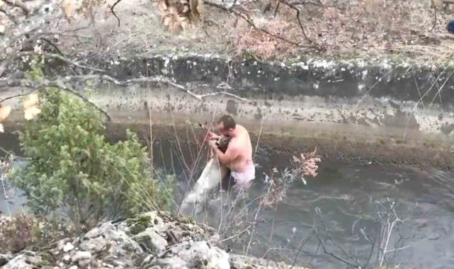 Kütahya'nın Gediz ilçesine bağlı Kayaköy'de hayvan severler, Hidroelektrik Santrali'ne su taşıyan kanala düşen karacayı yeraltı tünele girmesine 100 metre kala buz gibi suya girerek kurtardılar.