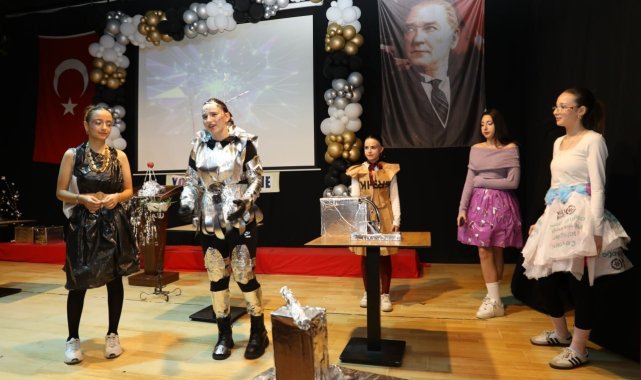 Lise öğrencileri atık malzemelerden hazırladıkları kıyafetlerle podyuma çıktı