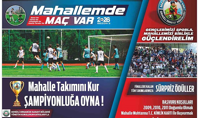 Denizli Emniyet İl Müdürlüğü'nün gençlerin toplum ve mahalle bilincinin geliştirmesi amacıyla düzenlemiş olduğu "Mahallemde Maç Var" futbol turnuvasının 2025/2026 yılı Denizli genelinde tüm ilçeleri kapsayacak şekilde üçüncü sezonuna başladığını duyurdu.Denizli Emniyet İl Müdürlüğü'nün gençlerin toplum ve mahalle bilincinin geliştirmesi amacıyla düzenlemiş olduğu "Mahallemde Maç Var" futbol turnuvasının 2025/2026 yılı Denizli genelinde tüm ilçeleri kapsayacak şekilde üçüncü sezonuna başladığını duyurdu. Başvuruların mahalle muhtarlıklarına yapılacağını detaylar için ise "mahallemdemacvar.com.tr" veya sosyal medya hesaplarından yayınlandığını belirtildi.