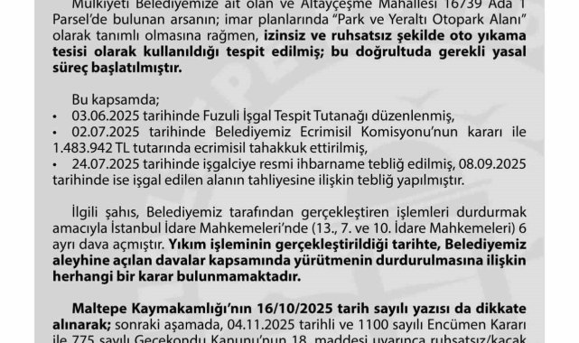 Maltepe Belediyesinden, mülkiyeti belediyeye ait olan bir arsa için ortaya atılan iddialarla ilgili açıklama yapıldı. Bahse konu arsanın; izinsiz ve ruhsatsız şekilde oto yıkama tesisi olarak kullanıldığının tespit edildiği ve bu kapsamda gerekli yasal süreçlerin başlatıldığı belirtilen açıklamada, "Hiçbir kişi ya da grubun kamu alanlarını haksız ve hukuka aykırı şekilde kullanmasına müsaade edilmeyecektir" denildi.
