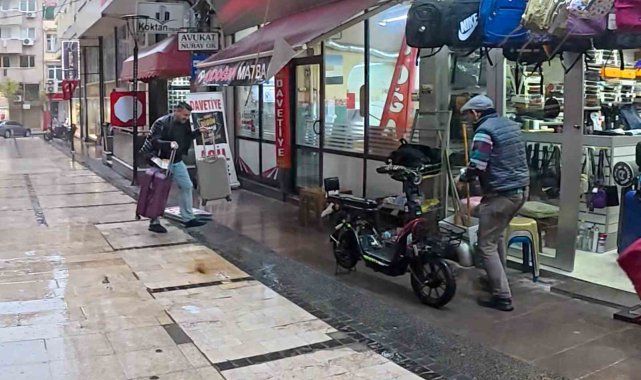 Manisa'da sabah saatlerinde başlayan şiddetli fırtına ve sağanak yağış hayatı olumsuz etkiledi. Şiddetli fırtına nedeniyle bir çantacı dükkanının önünden uçan valizleri başka bir esnaf kurtarırken, esnaf çareyi çantaları bağlamakta buldu.Manisa'da sabah saatlerinde başlayan şiddetli fırtına ve sağanak yağış hayatı olumsuz etkilerken, cadde kenarlarının adeta dere yatağına dönmesiyle vatandaşlar caddeden kaldırıma geçmekte güçlük çekti. Dükkanların önünde su birikintileri oluşturan yağmur sonrası esnaf kapılarının önlerindeki suları çekerek dükkanlarına girmesine engel oldu. Şiddetli rüzgar nedeniyle şemsiyelerini tutmakta güçlük çeken vatandaşlar büyük zorluklarla kaldırımlarda yürümeye çalışırken, cadde ve sokakların diğer günlere göre oldukça boş olduğu görüldü. Yağmuru beklediklerini ve güzel bir yağış olduğunu söyleyen Manisalı esnaf, yağmurun Manisa'ya bereket getirmesini diledi.Öte yandan, şiddetli fırtına nedeniyle çantacı dükkanının kapısının önünde duran valizler de sokağa savruldu. Yardım isteyen esnafın sokağa savrulan valizleri komşu esnaf tarafından zarar görmeden kurtarıldı. Valizleri kurtaran komşu esnaf Ahmet Cantür, "Son anda yakaladık. Şiddetli bir rüzgar çıktı. Aşağı doğru uçan valizleri son anda yakaladım" dedi.Yağmurun günün ilerleyen saatlerinde de devam etmesi bekleniyor.