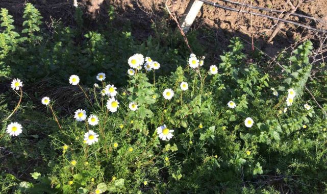 Manisa'nın Sarıgöl ilçesinde çok sayıda meyve ağacının çiçek açması ve bağların yaprak gözlerinin patlamasının ardından şimdi de baharın müjdecisi olan papatyalar çiçek açtı.