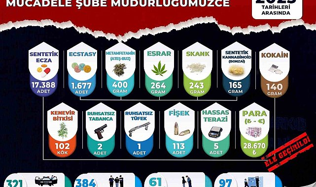 Manisa İl Emniyet Müdürlüğü, il genelinde uyuşturucu satıcılarına ve kullanıcılarına yönelik kapsamlı operasyonlarına devam ediyor. Haziran ayında Akhisar, Alaşehir, Salihli, Soma ve Turgutlu Narkotik Suçlarla Mücadele Büro Amirliklerinin de desteğiyle yürütülen çalışmalar kapsamında toplam 384 şüpheli yakalanırken, bunlardan 61'i tutuklandı. Aynı dönemde 97 aranan şahıs da yakalanarak adli mercilere teslim edildi. Haziran ayı boyunca gerçekleştirilen operasyonlarda; 17 bin 388 adet sentetik ecza (hap), bin 677 adet ecstasy hap, 264 gram esrar, 243 gram skunk, 140 gram kokain, 165 gram sentetik kannabinoid (bonzai), 400 gram metamfetamin, 102 kök hint keneviri, 2 adet ruhsatsız tabanca, 1 adet ruhsatsız av tüfeği, 113 adet fişek, 5 adet hassas terazi, 28 bin 670 TL uyuşturucu ticaretinden elde edildiği değerlendirilen nakit para ele geçirildi.