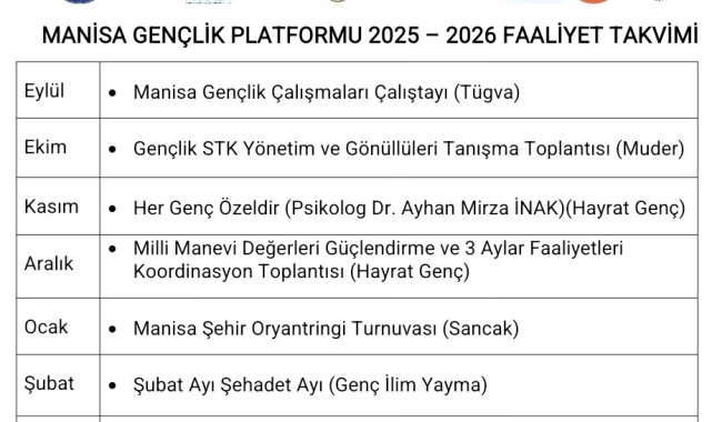 Manisa'da faaliyet gösteren ve gençlere yönelik faaliyetlerde bulunan sivil toplum kuruluşlarının bir araya gelerek oluşturduğu Manisa Gençlik Platformu, Yürütme Kurulu Toplantısı Manisa Öğretmenevinde gerçekleştirildi. Toplantıda MAGEP'in 2025-2026 faaliyet takvimi açıklandı.Yeni açıklanan faaliyet takvimine göre eylül ayında Tügva tarafından gençlik hizmetlerinin tüm taraflarıyla birlikte gerçekleştirilmesi planlanan 'Manisa Gençlik Çalışmaları Çalıştayı' ile faaliyetlere başlanacak. Ardından gençlik çalışması yapan sivil toplum kuruluşları, yönetimleri ve gönüllüleri bir tanışma toplantısında Manisa Uluslararası Öğrenci Derneği tarafından bir araya getirilecek. Hayrat Genç tarafından "Her Genç Özeldir" salon programı gerçekleştirilecek ve yine 3 ayların başlangıcında "Milli Manevi Değerlerin Güçlendirilmesi" noktasında neler yapılabilir sorusuna cevap aranacağı bir toplantı gerçekleştirilecek.Ocak ayına gelindiğinde Sancak Derneği tarafından Manisa şehrinin gençler tarafından daha yakından tanınmasına yönelik "Şehir Oryantiring Turnuvası" gerçekleştirilecek. Genç İlim Yayma tarafından "Şubat Ayı Şehadet Ayı" salon programı gerçekleştirilecek. Bir sonraki ay Genç Kadem tarafından "Sosyal Medyada Ben Olmak" programı ve sivil toplum kuruluşlarının birbirlerini daha yakından tanımasına imkan sağlayacak "STK'lar Arası Futbol Turnuvası" Genç Memur Sen tarafından gerçekleştirilecek. Nisan ayında Genç İHH tarafından "Spil Doğa Kampı" gerçekleştirilecek. Genç Önder tarafından "İmam Hatip Okulları Gecesi" mayıs ayında yapılacak ve haziran ayında ise 15 Temmuz etkinliklerine yönelik bir hazırlık toplantısı Genç Ensar tarafından gerçekleştirilecek. Faaliyet takviminin son etkinliği olarak Tügva tarafından düzenlenecek olan "Ortak Gençlik Kampı" ile dönem tamamlanacak.