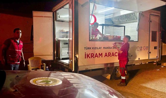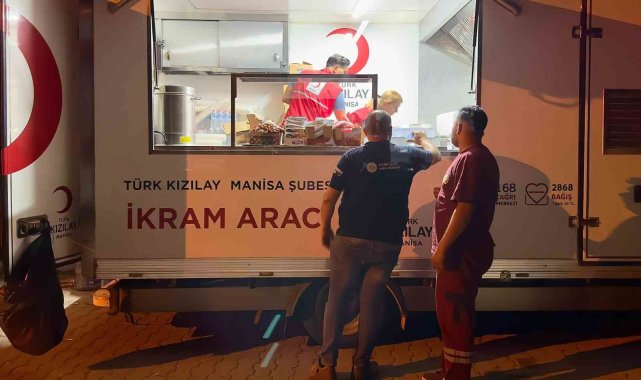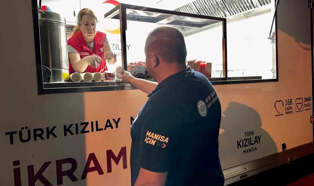 Türk Kızılay Manisa İl Merkezi ekipleri, Manisa-Uşak sınırında orman yangınıyla mücadele eden ekiplerle yemek, çay, ayran, su ve çeşitli ikramlarda bulundu.