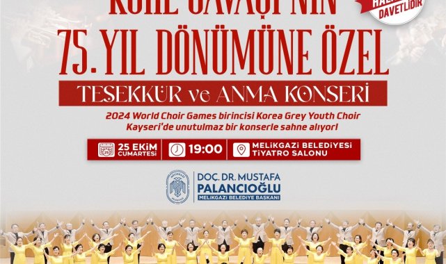Melikgazi Belediyesi ev sahipliğinde, Erciyes Üniversitesi, Türk Muharip Gaziler Derneği, Active Seniors As Always (ASAA), Korea-Türkiye Dostluğu Derneği iş birliği ile "Kore Savaşı'nın 75. Yıl Dönümüne Özel Teşekkür ve Anma Konseri" düzenleniyor.
