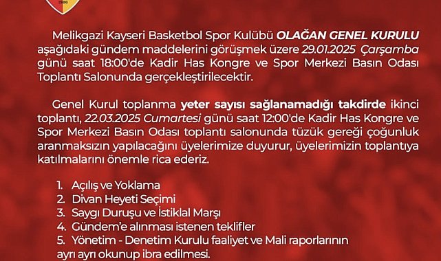 ING Kadınlar Basketbol Süper Ligi takımlarından Melikgazi Kayseri Basketbol Kulübü Olağan Genel Kurul yapacak. Melikgazi Kayseri Basketbol Kulübünden yapılan açıklamada, "Melikgazi Kayseri Basketbol Spor Kulübü Olağan Genel Kurulu birinci toplantı 29 Ocak 2025 Çarşamba Saat 18.00'de Kadir Has Kongre ve Spor Salonunda, çoğunluk sağlanamazsa ikinci toplantı tüzük gereği 22 Mart 2025 Cumartesi saat 12.00'de gerçekleşecek" denildi. Olağan Genel Kurul'da tüzük değişikliği ile yönetim ve denetim kurulunun faaliyet ve mali raporları okunup ibra edilecek.