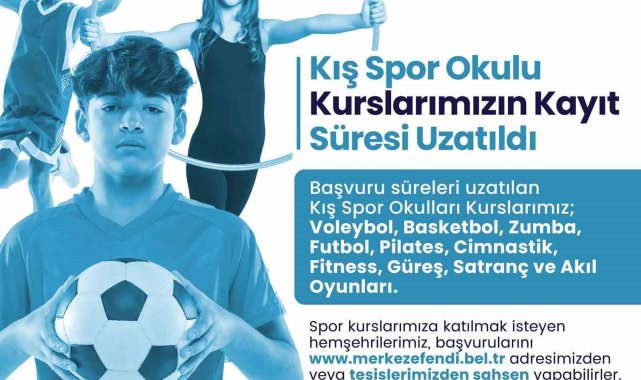 Merkezefendi Belediyesi tüm vatandaşları sporla iç içe olmalarını sağlamak amacıyla düzenlenen kış spor okullarında kayıt süresi uzatıldı.Merkezefendi Belediyesi, kış dönemi spor kurs kayıt sürelerini uzattı. Basketbol, futbol, voleybol, tenis, badminton, robotik kodlama, cimnastik, halk oyunları, satranç, pilates, zumba, fitness, güreş, izcilik, boks ve kaleci branşlarında verilecek olan kış spor okulları kurslarında kayıt süresi uzatıldı.16 branşta verilecek kurslara başvurular Merkezefendi Belediyesi internet adresinden veya tesislerden şahsen yapılacak.