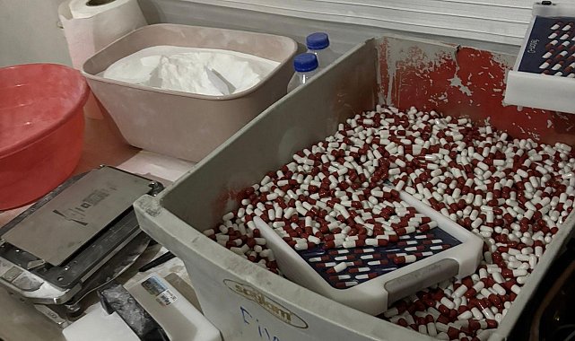 Mersin'de narkotik ekiplerinin düzenlediği operasyonda sentetik ecza imalathanesi deşifre edilirken, yüklü miktarda ham madde ve binlerce hap ele geçirildi. Olayla ilgili gözaltına alınan 3 şüpheliden 2'si tutuklandı.Mersin İl Emniyet Müdürlüğü Narkotik Suçlarla Mücadele Şube Müdürlüğü ile Mezitli İlçe Emniyet Müdürlüğü ekiplerince, uyuşturucu madde ticareti ve kullanımını engellemeye yönelik yürütülen çalışmalar kapsamında Yenişehir ilçesinde bir adreste sentetik ecza hap üretimi yapıldığı bilgisine ulaşıldı. Belirlenen adrese düzenlenen operasyonda, 65 kilo 250 gram sentetik ecza ham maddesi (pregabalin), 45 bin 482 adet doldurulmuş kapsül, 135 bin 100 adet boş kapsül, bin 850 adet ilaç kutusu, 25 gram metamfetamin, 810 adet beyaz renkli hap kutusu, 420 adet kapak, 2 adet ilaç basım makinesi, 1 adet mikser ile 708 blister halinde 9 bin 912 adet sentetik ecza ele geçirildi.Operasyon kapsamında gözaltına alınan A.Ç., S.Ç. ve E.A. isimli şüphelilerden A.Ç. ile E.A. çıkarıldıkları mahkemece tutuklanırken, S.Ç. hakkında adli kontrol kararı uygulandı.Mersin Emniyet Müdürlüğünden yapılan açıklamada, halkın huzur ve güvenliğini tehdit eden uyuşturucu tacirlerine karşı mücadelenin kararlılıkla sürdürüleceği belirtildi.