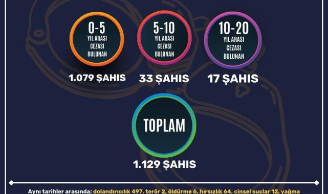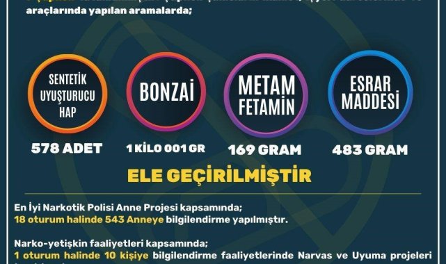Mersin'de son bir haftada gerçekleştirilen çalışmalarda, haklarında çeşitli suçlardan yakalama kararı bulunan bin 129 kişinin yakalandığı bildirildi. Aynı tarihler arasında gerçekleştirilen uyuşturucu ile mücadele çalışmalarında ise yakalanan 114 şahıs hakkında işlem yapılırken, 7 şüpheli de tutuklandı.Mersin'de, 'Güvenlik, Asayiş Değerlendirme Toplantısı', Vali Ali Hamza Pehlivan başkanlığında yapıldı. Toplantıda il genelinde güvenlik ve asayiş konularında yerine getirilen çalışmalar, alınan tedbirler ile suç ve suçlulara karşı gerçekleştirilen operasyonlar ele alındı. Vali Pehlivan, toplantıyla ilgili yaptığı açıklamada, 12-19 Ocak arasında emniyet ve jandarma ekiplerince yürütülen operasyonel çalışmalarda, haklarında çeşitli suçlardan yakalama kararı bulunan bin 129 kişinin yakalandığını belirtti. Aynı tarihler arasında dolandırıcılık, terör, cinayet, hırsızlık, yağma, cinsel suçlar gibi çeşitli suçlardan 589 şahsın gözaltına alınarak adli makamlara teslim edildiğini ifade eden Pehlivan, gerçekleştirilen trafik denetimlerinde ise 83 bin 492 aracın kontrol edildiğini, 261 aracın trafikten men edildiğini, 15 bin 948 araç ve sürücüsüne de işlem yapıldığını kaydetti.Uyuşturucu ile mücadele çalışmalarıAynı tarihler arasında gerçekleştirilen uyuşturucu ile mücadele çalışmalarına da değinen Pehlivan, "Gerçekleşen 99 narkotik olayı sonrası yakalanan 114 şahıs hakkında işlem yapılırken, 7 şüpheli de tutuklandı. Şüpheli şahısların ikamet, iş yeri ve araçlarında yapılan aramalarda ise 578 adet sentetik uyuşturucu hap, 1 kilo bonzai, 169 gram metamfetamin ile 483 gram esrar ele geçirildi" dedi.En İyi Narkotik Polisi Anne Projesi kapsamında 543 anneye bilgilendirme yapıldığını, narko-yetişkin faaliyetleri kapsamında da 10 kişiye Narvas ve Uyuma projelerinin tanıtıldığını ifade eden Pehlivan, Mersin'in huzuru ve güvenliğini daim kılmak için emniyet, jandarma ve sahil güvenlik birimlerinin çalışmaya devam ettiğini kaydetti.